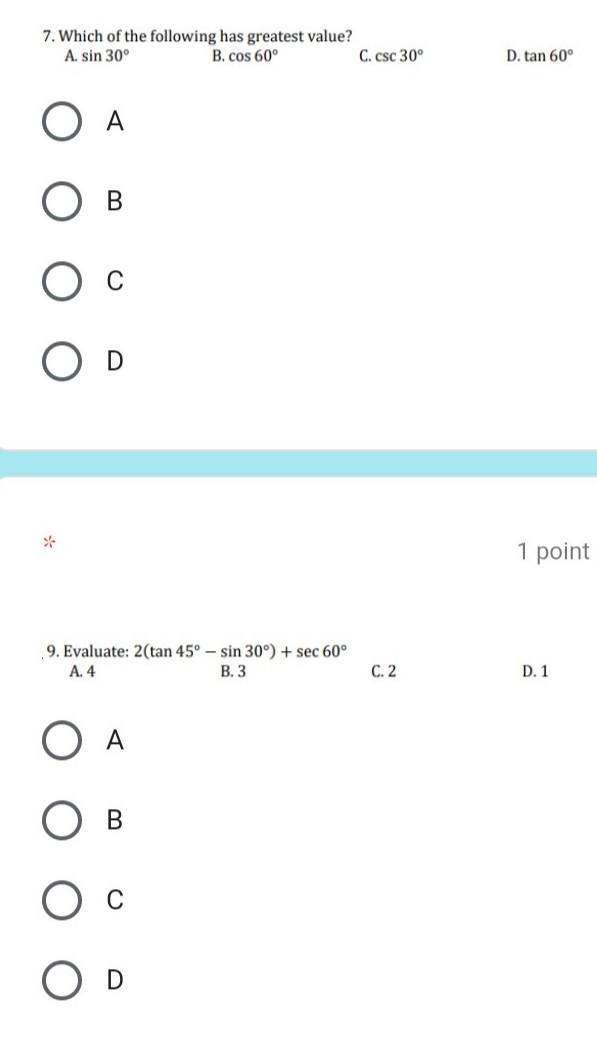 Posting Komentar untuk "The Value Of Tan 45/ Sin 30 + Cos 60 Is / Find The Value Of I Sin 30 Cos 60 Ii Sin 0 Cos 0 Iii Tan 45 Tan 37 Iv Sin 390 V Cos 405 Vi Tan 420 Vii Sin 150 Viii Cos / Which of the following statements is correct?"
